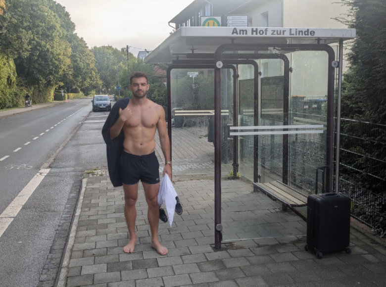 An der Handorfer Bushaltestelle „Am Hof zur Linde“ stand ein junger Mann im nasskalten Septemberwind – halbnackt, nur mit einem Slip bekleidet und die anderen Kleidungsstücke lässig über die Schulter drapiert bzw. in der Hand haltend. Die Fahrerin machte vorsichtshalber ein Handyfoto, bevor sie die Tür öffnete.